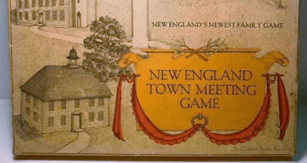 You roll dice and move your pawn along a path through the town. There are incidents in your path concerning the town meeting as you progress to the town common. …The incidents are believable and reflects what could actually happen before or during an actual town meeting. First player to reach the town common wins!
