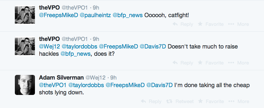 This was a reference to WCAX mistakenly broadcasting a crime scene photo including the body of a murder victim, which the Freeploid wrote up at great length. Seven Days’ Mark Davis Tweeted a reply about the ‘Loid “firing cheapshots at WCAX.” To which the Freeploid’s Adam Silverman replied “Is someone from Seven Days really one to talk about cheap shots?”