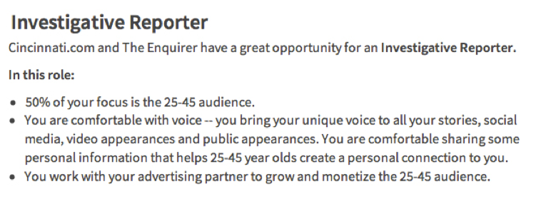 I included this expectation [for the reporter to work with the ad side] in all beat job descriptions, though it’s less likely to be relevant in some than others. It’s less likely to be relevant for investigative than the health reporter, for example.