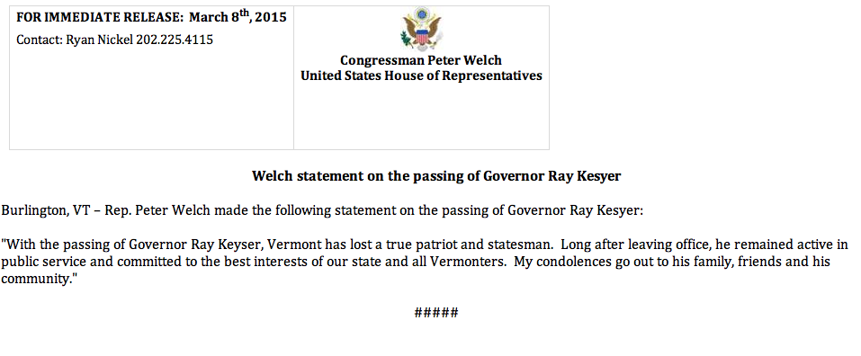 Standard operating procedure for politicians, when one of their own shuffles off this mortal coil, is the issuance of a press release. Congressman Peter Welch dutifully did so. Unfortunately, this being a weekend, the staff failed to give their full attention to the formality.
