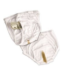 This abomination of consumer culture is called the BriefSafe. It’s a pair of underwear with a hidden pocket for your passport, cash, etc. Which, hey, not often you can combine discomfort with the embarrassment of going into a store and having to fish your money out of your undies. But the real topper is that the briefs look like they’ve been disgustingly soiled, so pickpockets will be afraid to touch your stuff.