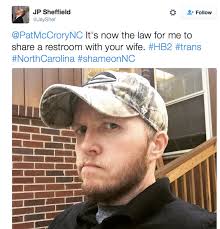NCTransThis is a famous Tweet sent by a trans man from North Carolina, which shows the absurdity of anti-trans bathroom policies. That’s the reality of making people use the bathroom that jibes with their birth certificates: men who look like JP Sheffield being forced to use the women’s room.