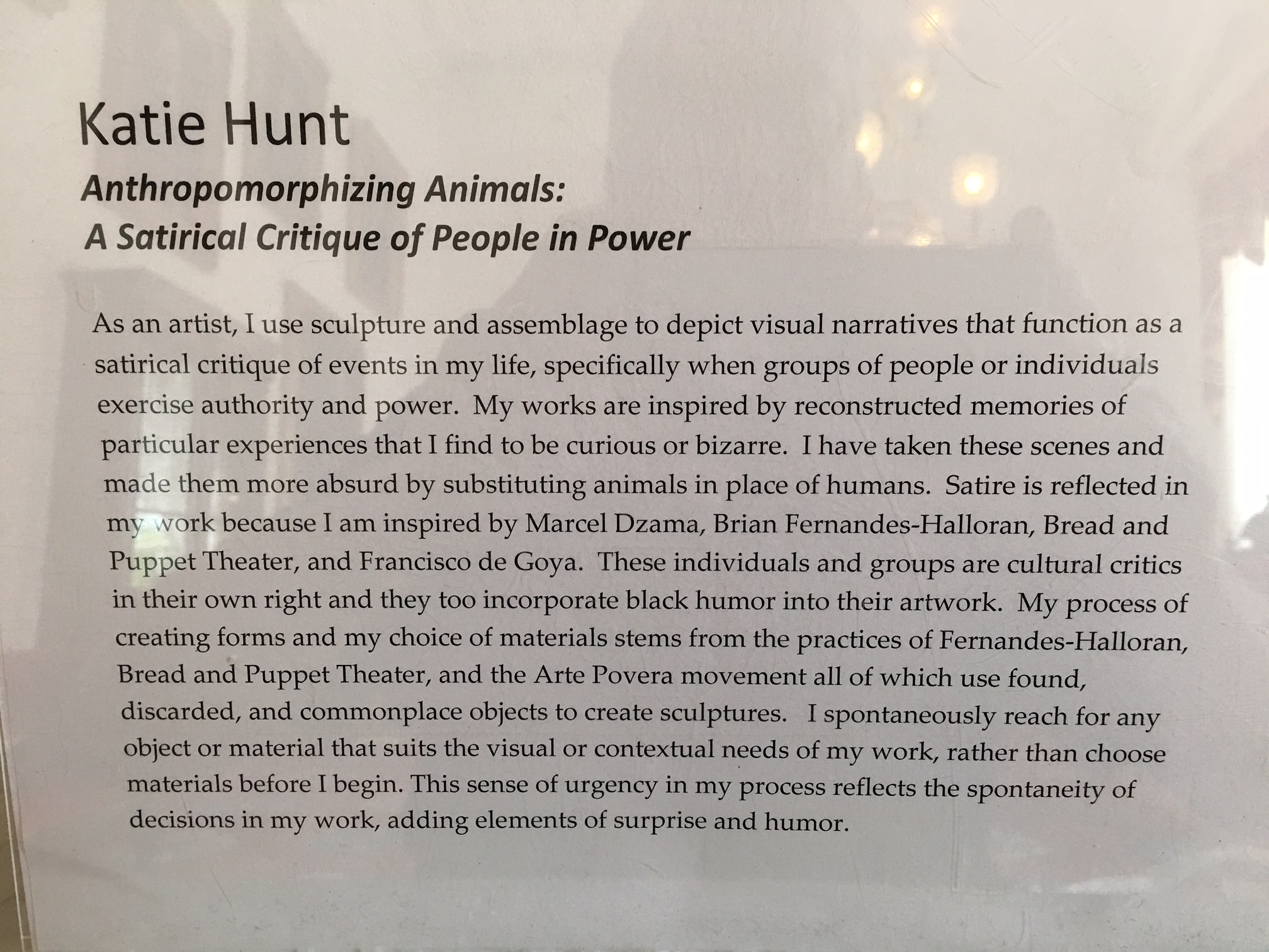 And there’s a dissonance between the tenor of the work and the pretentious, wordy Artist’s Statement on view (pictured nearby). She claims Bread and Puppet Theater as inspiration, and posits her work as “satirical critique of events in my life, specifically when groups of people exercise authority and power.”