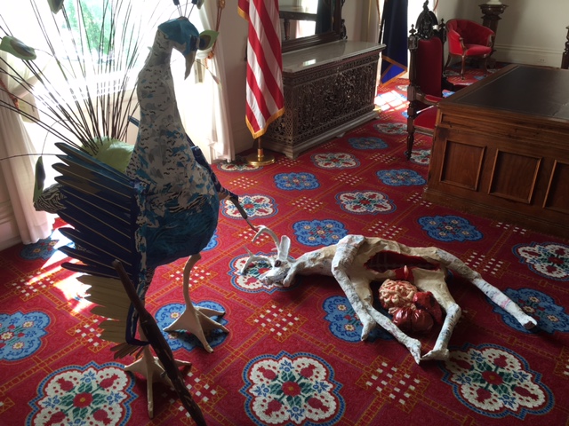 Perhaps this was all meant as lighthearted satire, but it struck me as sour, bitter, and vengeful. And I wonder about the appropriateness of the setting: this is tourist season at the Statehouse, and there’s a steady parade of visitors wanting a glimpse of the ceremonial office. For most of them, the installation must be a puzzling distraction. It’s certainly out of character with the room, which is full of antique furniture and portraits of Dead White Governors. The artist is identified as “Katie Hunt,” but there’s no mention of her marital connection to the office’s official occupant.