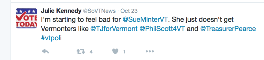 jk-bioKennedy presents herself as a dedicated ticket-splitter, a presumed liberal who’s voting for a lot of Democrats — but not Sue Minter. According to her Twitter bio, she lives in Brattleboro and just opened her Twitter account in August of this year.