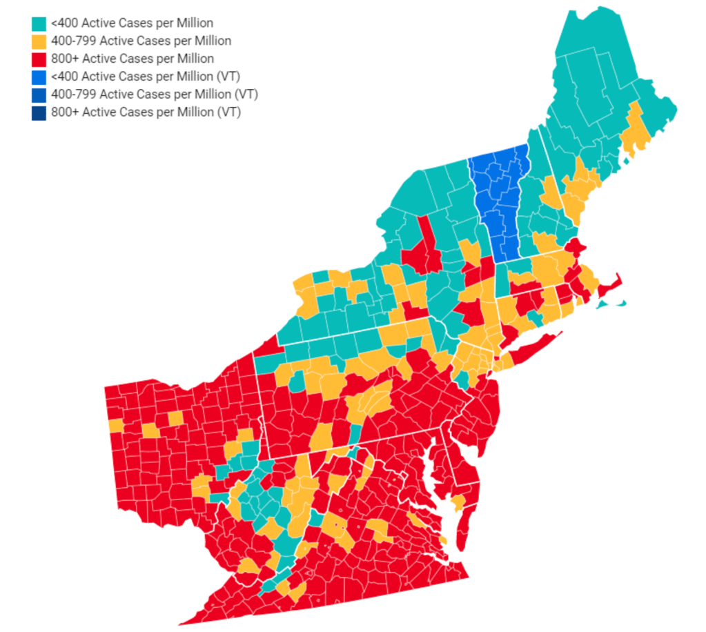 As a reminder, each area is a county. “Green” counties have low Covid rates, so their residents can travel to Vermont without restriction. But on July 11, there was already a lot more yellow and red, and a lot less green, than on June 30.