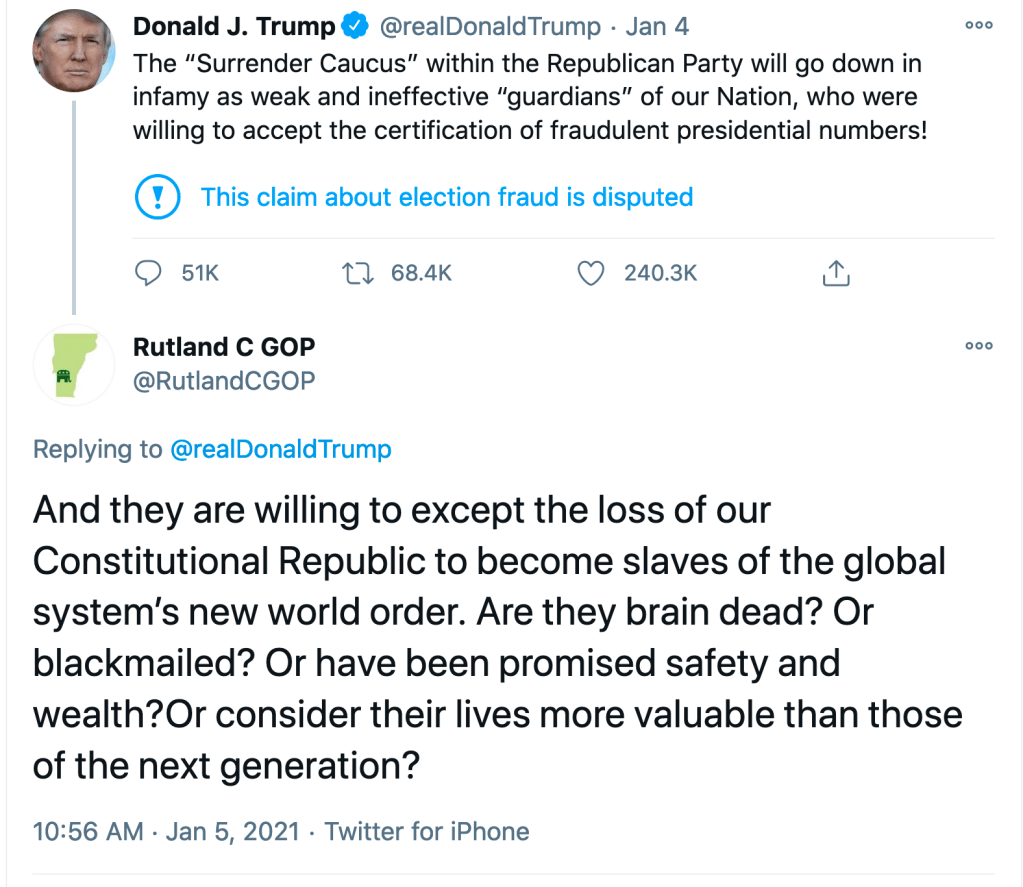 Party leaders like VTGOP chair Deb Billado and Republican National Committeeman Jay Shepard and party vice-chair Deb Bucknam (last seen representing the town of Stamford in its ridiculous legal challenge to the governor’s Covid policies) are deeply committed to Team Trump. They publicized the CovidCruiser trip and asked party members to join in. The Chittenden County Republicans lent their names to the bus trip. And it was only a couple days ago when the Rutland County Republicans tweeted out this inflammatory response to an inflammatory Trump tweet: