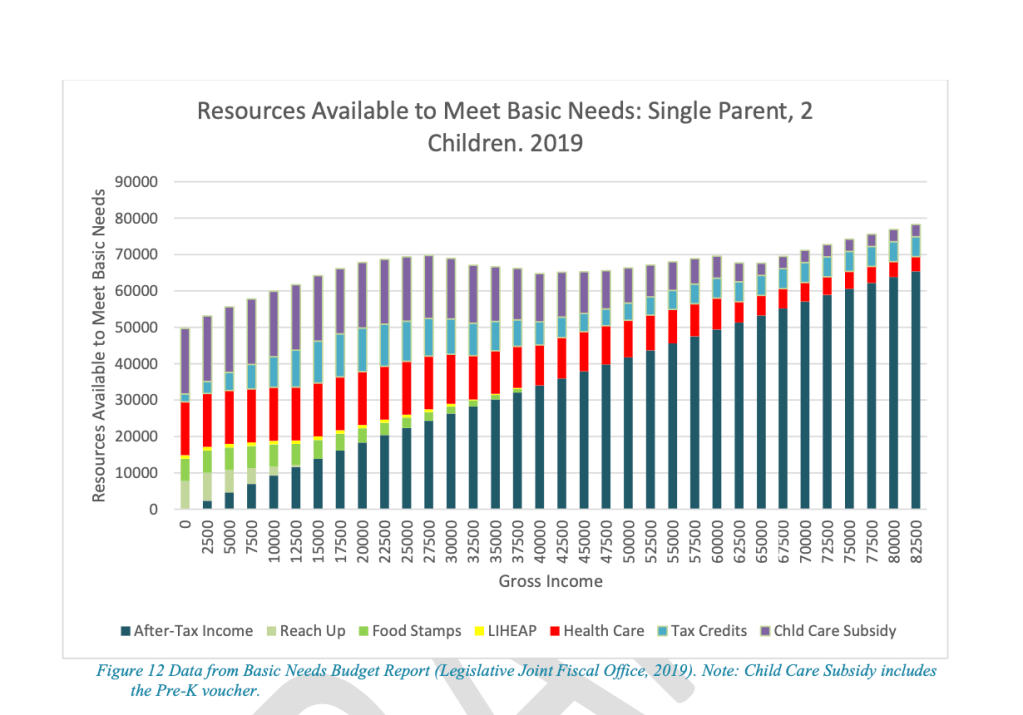 The lowest-income Vermonters, as you can see, are almost completely dependent on social service programs. As their incomes rise, their eligibility for assistance drops. What’s clearly visible on this chart is not a “benefits cliff” but a pernicious “benefits trough.” Total available resources (income plus benefits) hits a peak around $27,500 in annual income. It then drops, and doesn’t surpass the $27,500 figure until an individual reaches almost $70,000 in income.