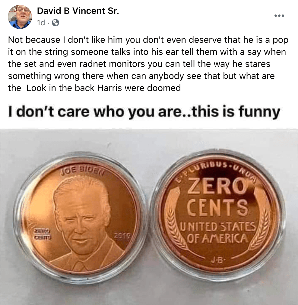 Hey everybody, meet David B. Vincent Sr., resident of Georgia, Vermont and candidate for town Selectboard. He’s running against former state representative and senator Carolyn Branagan. And I’m going to take you on a merry tour of his Facebook page. In addition to the usual Trumpster memes, it also features commentaries by Vincent that are so badly written, it’s hard to tell what he meant to say. For instance, I’ve never heard “bitch in a nut” before, but maybe that’s a Franklin County colloquialism.