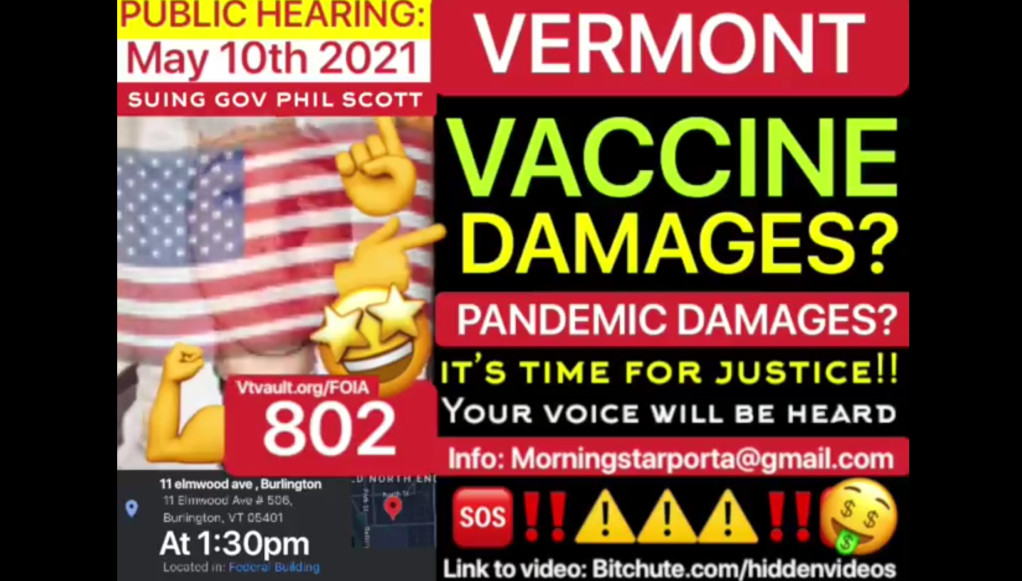 These fine folks had high hopes for a Monday hearing in a lawsuit brought by six Vermonters against Scott, Attorney General TJ Donovan, and other worthies, for allegedly unconstitutional pandemic policies and misrepresentation of the facts about Covid-19. One of the six is perpetual crank candidate Emily Peyton, which gives you a pretty good idea of the nature of this crew. As of this writing, we haven’t heard the outcome of the hearing. But I’m guessing a quick dismissal followed by angry rants on the courthouse steps.