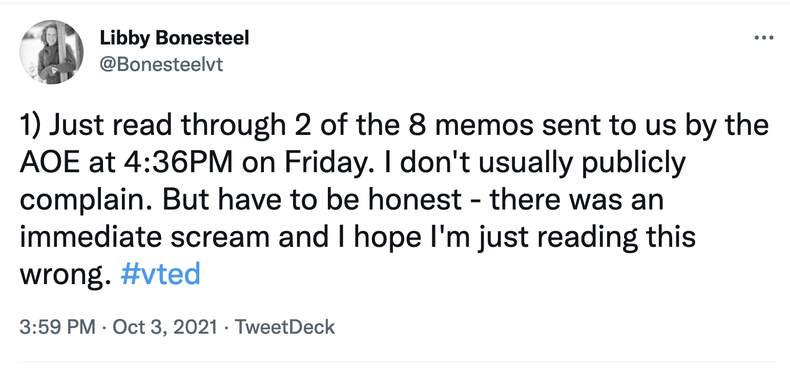 How was this “guidance” received? Let us turn to the Twitter feed of Libby Bonesteel, superintendent of the Montpelier Roxbury School District.