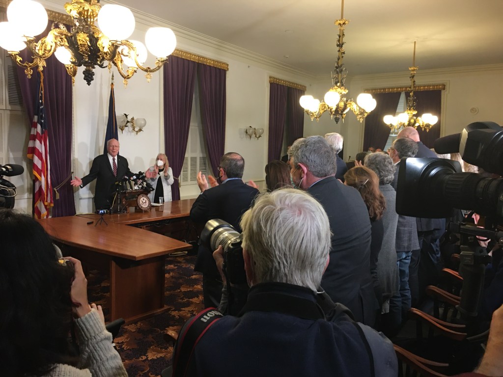 He received standing ovations at the beginning and end of his statement from a few dozen Democratic bigwigs. The press were shunted off to one side, which did not allow for the slightest bit of social distancing. We were just part of the scenery; Leahy did not take questions from the peanut gallery.