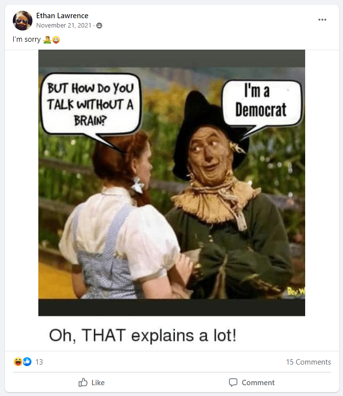 People of Essex, be forewarned. The man who uses this as his social media image is Ethan Lawrence, candidate for Selectboard. In fact, Ethan Lawrence is the only name on the ballot for the office he seeks. But he’d be such a disaster that town Democratic Party chair Brian Shelden has stepped forward as a write-in candidate in hopes of derailing Lawrence’s bid for office.