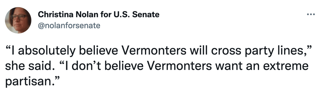 I’m honestly surprised that Nolan, a native Vermonter, is so completely clueless about the politics of her home state. Cookie-cutter conservative attacks don’t work. They just make you look mean, when your only ticket to success is by presenting yourself as a caring, considerate moderate who’d make a lovely next-door neighbor. (See also: Scott, Phil.)