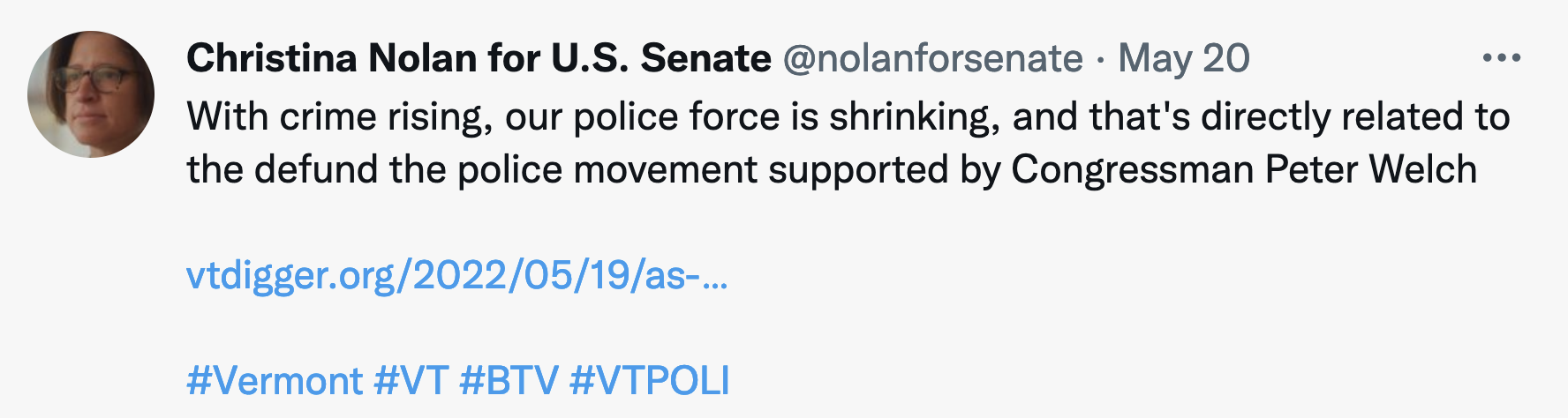 Every word in that tweet is pure horse hockey. Crime isn’t rising unless you tease out a convenient subset. Police forces aren’t shrinking, except where they have trouble with recruitment and retention. Finally, there’s no evidence whatsoever that Welch supports “the defund the police movement,” which has been thoroughly marginalized by, uh, moderate Democrats like Welch.
