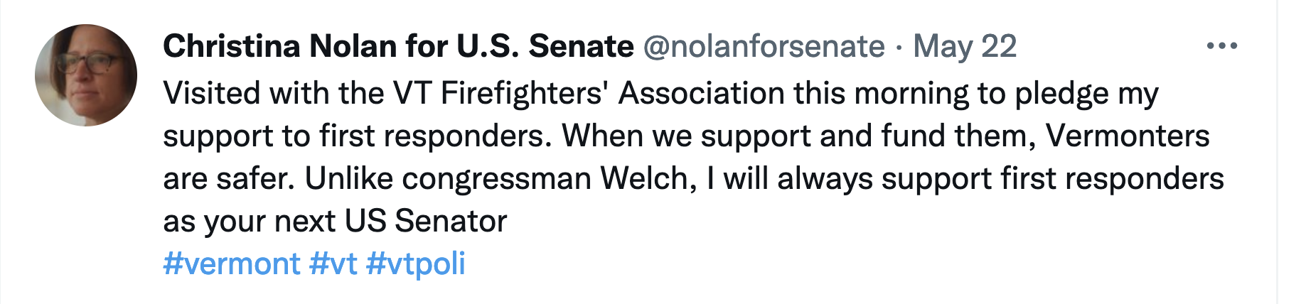 I don’t know if the lower-case “congressman” is a deliberate act of disrespect or a careless typo, but the substance is equally offensive. Does anyone really think that Welch doesn’t “support first responders”?