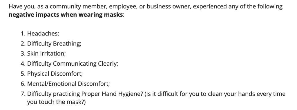 The Survey is nothing more than a means for collecting anecdotal “evidence” from those who have a phobia about masks, on their own faces or anywhere else. Lest you think I exaggerate, here’s what the Survey is looking for.