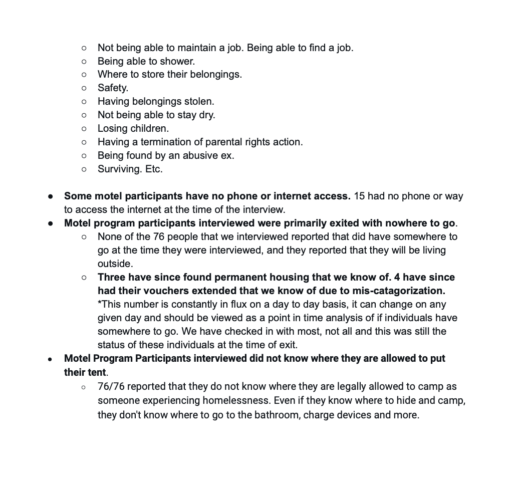 Almost two-thirds connected to support services during their motel stays. This, despite Human Serviced Secretary Jenney Samuelson’s contention that the voucher program must end because there are no connections to support services.