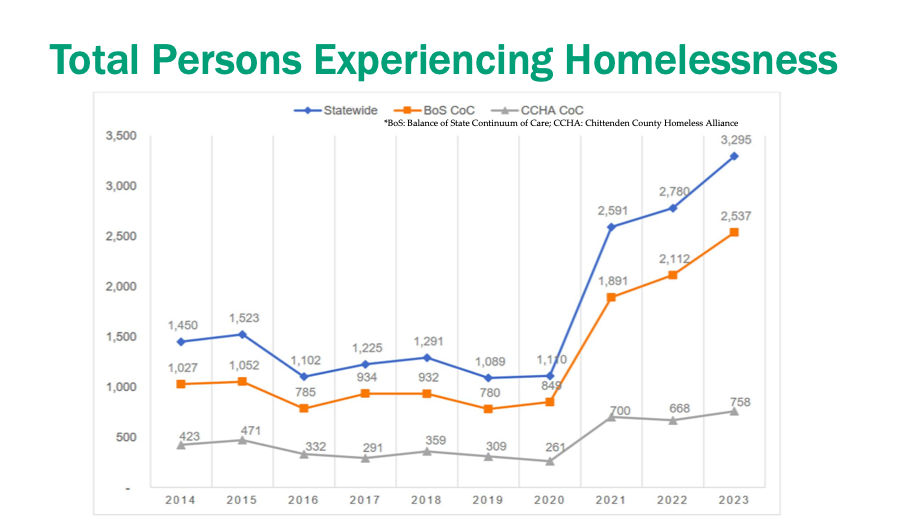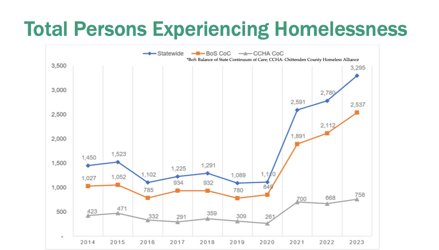 Now, there’s a picture that tells a story. The blue line represents the number of homeless Vermonters reported in the federal government’s annual Point in Time count. And it shows that homelessness has skyrocketed since the year 2000, with by far the biggest increase between January 2020 and January 2021.