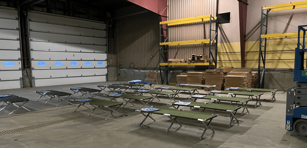 Actually, as of the orchestrated press tour on Friday morning, only one shelter (in WIlliston) had opened for business. Hasty preparations were still underway at the Waterbury Armory and reporters were not allowed to enter, according to VTDigger. The Waterbury space reportedly features partitioned areas for families, with the partitions not reaching the ceiling. The Williston facility looked a bit more inviting.