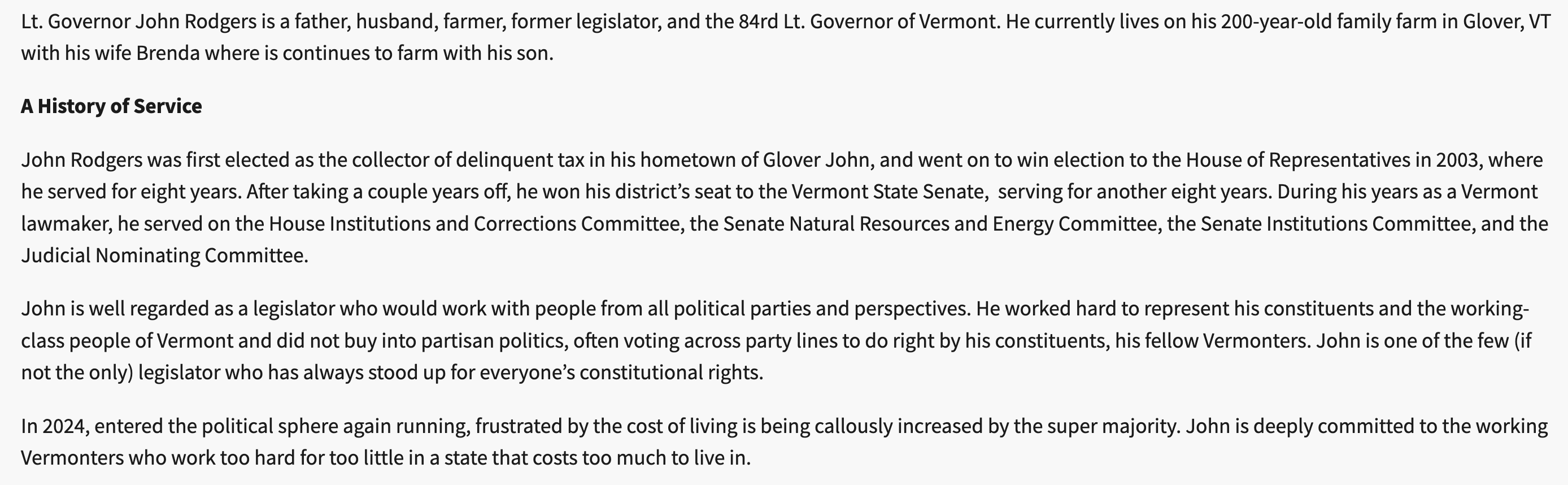 But wait, there’s even more. I now know how that “84rd” thing got in there. Rodgers stole the first line of his official bio hook, line, and “rd” from his predecessor (and 83rd lieutenant governor) David Zuckerman’s official bio.