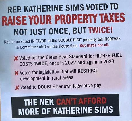 So he apparently failed to report at least three mailers. And many of the mailers mentioned other candidates who went unreported in Douglass’ mass media filings. Two prominently featured the endorsement of Gov. Phil Scott. One mailer mentioned eight Republican lawmakers from the Kingdom as endorsing Douglass. I’m sure his fellow Republicans won’t mind, but three postcards featured harsh attacks against Sims as a tax-and-spender. How harsh? You make the call.