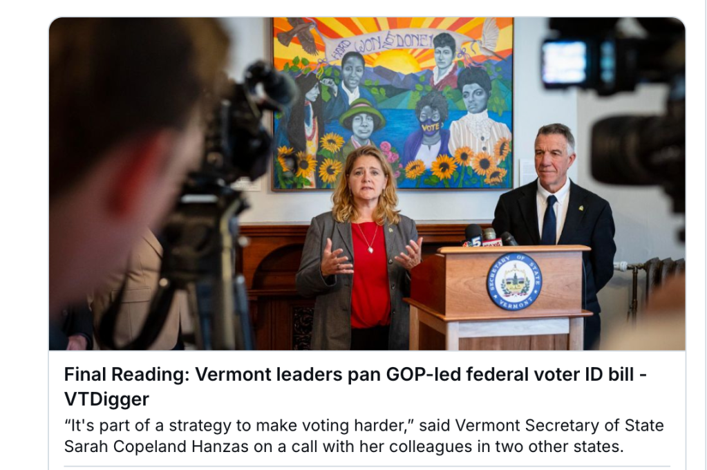 This is a social media post from VTDigger spotlighting the top story in Friday’s “Final Reading,” about Vermont politicians taking a stand against a U.S. House-passed voter ID bill that would make it harder, especially for women, to register to vote. Great, fine, a nice little space-filler on Friday afternoon.