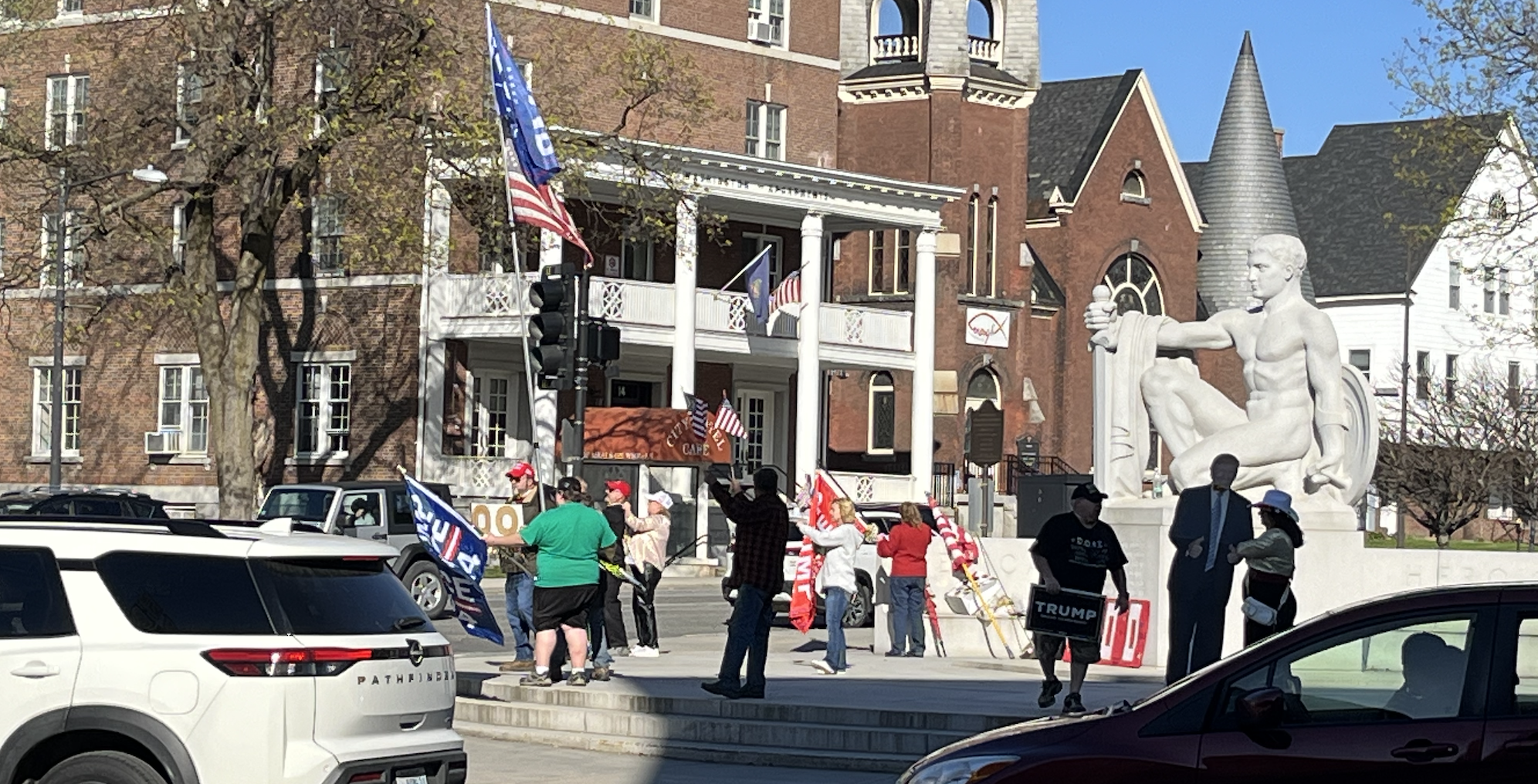 Today I stopped by a “honk and wave” event in downtown Barre, held by fans of Donald Trump to mark the 100th day of his second term. And there, pictured above, is the “crowd.” About a dozen people at most.