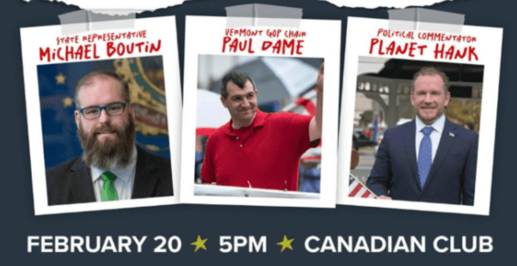 The boys have reined in their expectations regarding speakers. They’ve dropped the “Invited” list that (laughably) included Gov. Phil Scott and professional anti-trans activist Riley Gaines. Two of the confirmed speakers from January are back on the agenda: State Rep. Michael Boutin of Barre, a first-term lawmaker with some decidedly outré views, and Vermont Republican Party chair Paul Dame.