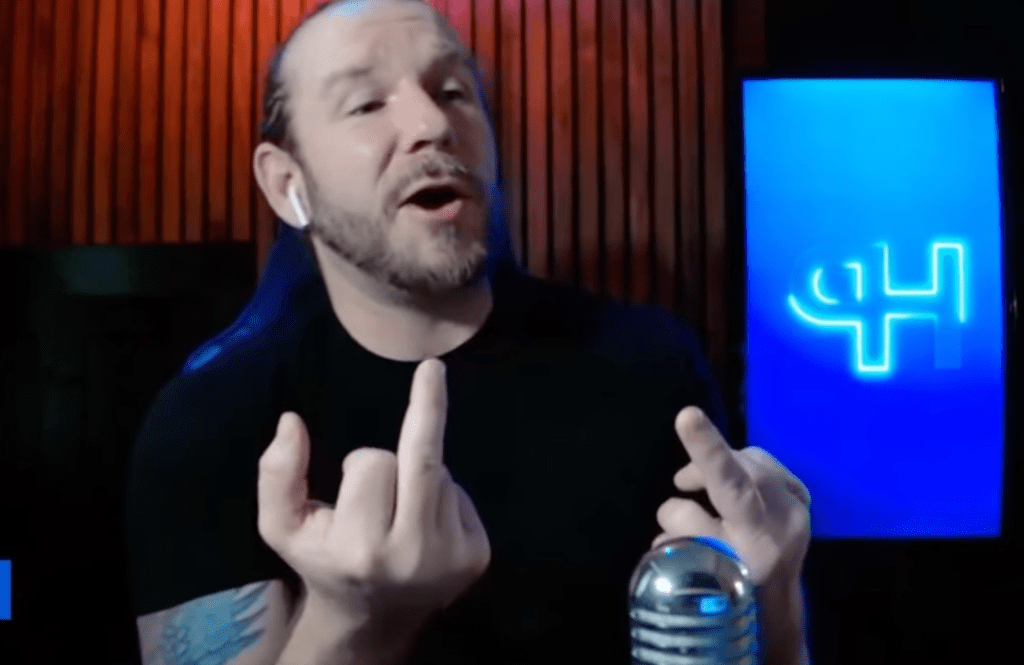 Where do I start? Well, how about the image above? Planet Hank flying the double bird as he lets loose with an unhinged rant apparently aimed at his ex-wife. Here’s the first trigger warning.
