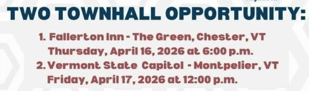 For the record, the grammatically-challenged (“Townhall” one word? Two “opportunity”?) twice-failed candidate for lieutenant governor is the mastermind who gave us a dismally under-attended series of pro-Trump rallies in 2025, He was also a featured speaker at a 2025 “Parent’s (sic) Rights in Education” (read: anti-trans and DEI) event in the Statehouse. And he spoke at a 2022 anti-critical race theory bitchfest in Montpelier.