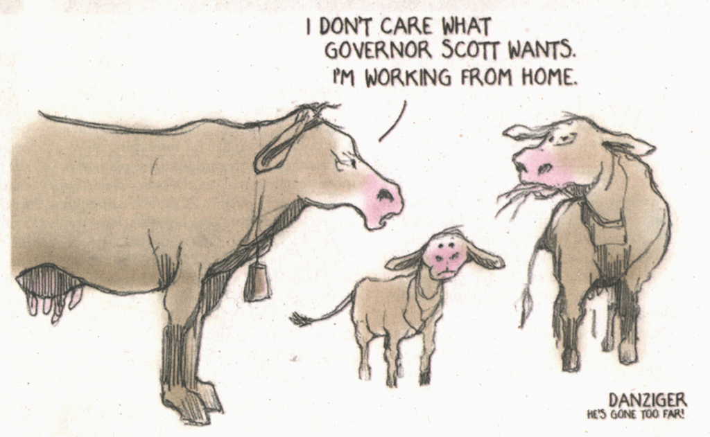 The subject was Scott’s return-to-office order for state employees. That’s the one in serious jeopardy thanks to a unanimous ruling by the state Labor Relations Board. That’s the Board whose five members were all nominated and/or vetted by the Scott administration.