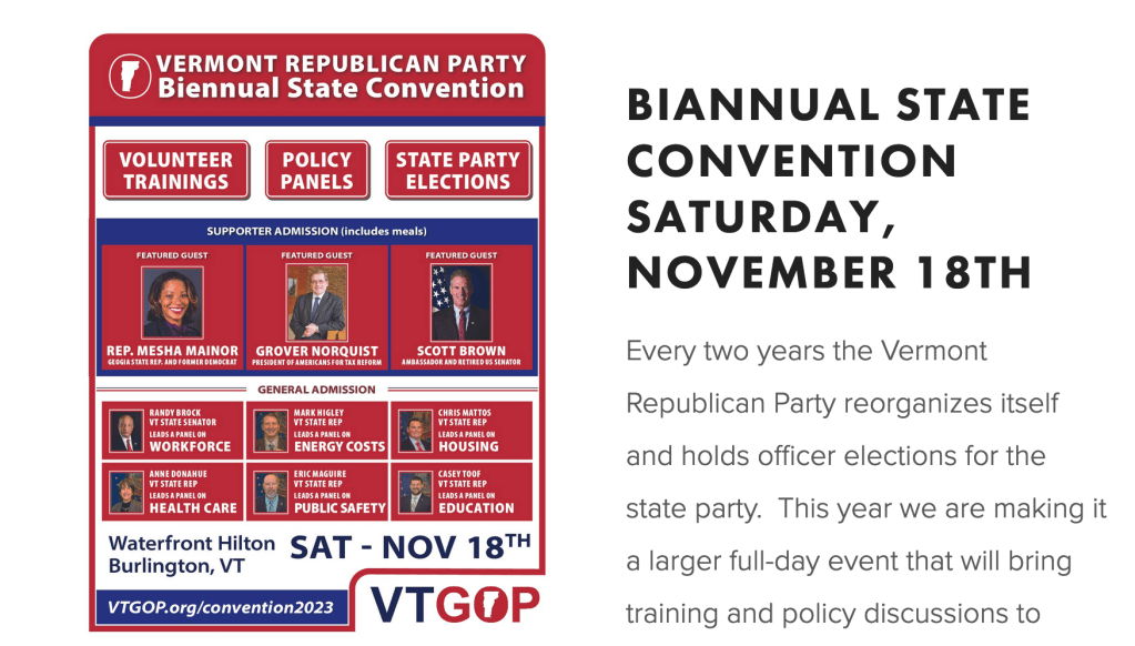 The Vermont Republican Party held its biannual, or possibly biennual, convention on Saturday. (Above screenshot from the VTGOP’s own website, although they might get around to fixing it after they read this post.) They actually had kind of an impressive speaker lineup, including Reagan-era anti-tax activist Grover Norquist (who must have been wondering how the hell his career descended to the point where he was sharing breakfast with a few dozen graybeards in frickin’ Burlington), Scott Brown, who’s gotten an incredible amount of mileage out of one lucky victory thirteen years ago, and Georgia state Rep. Mesha Mainor, who switched her affiliation from Democratic to Republican after differing with her former party’s caucus on some high-profile issues.