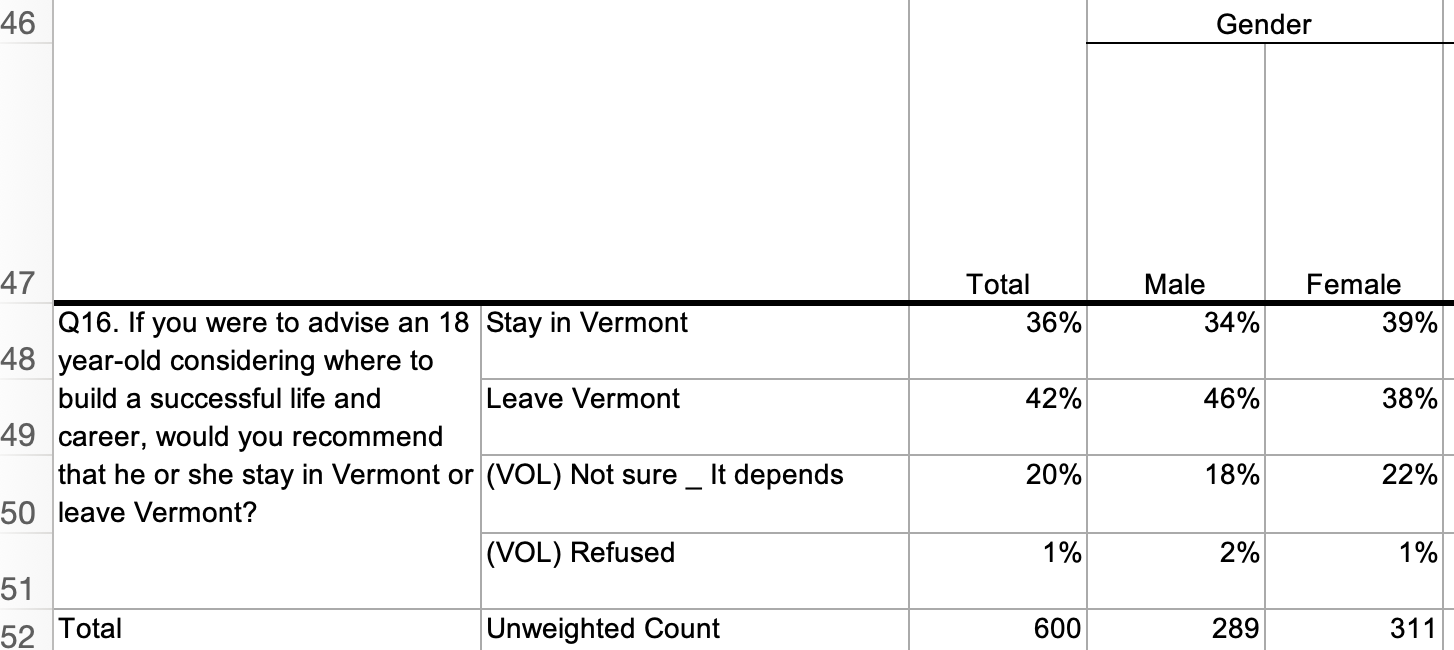 The total result goes right down the middle: A bit more “leave” than “stay” with a sizable tranche “not sure.” Within that, however, Republicans were far less sanguine on Vermont as land of opportunity. A full 63% of Republicans said “leave.” Among independents, that number was 32%, and for Democrats it was 43%.