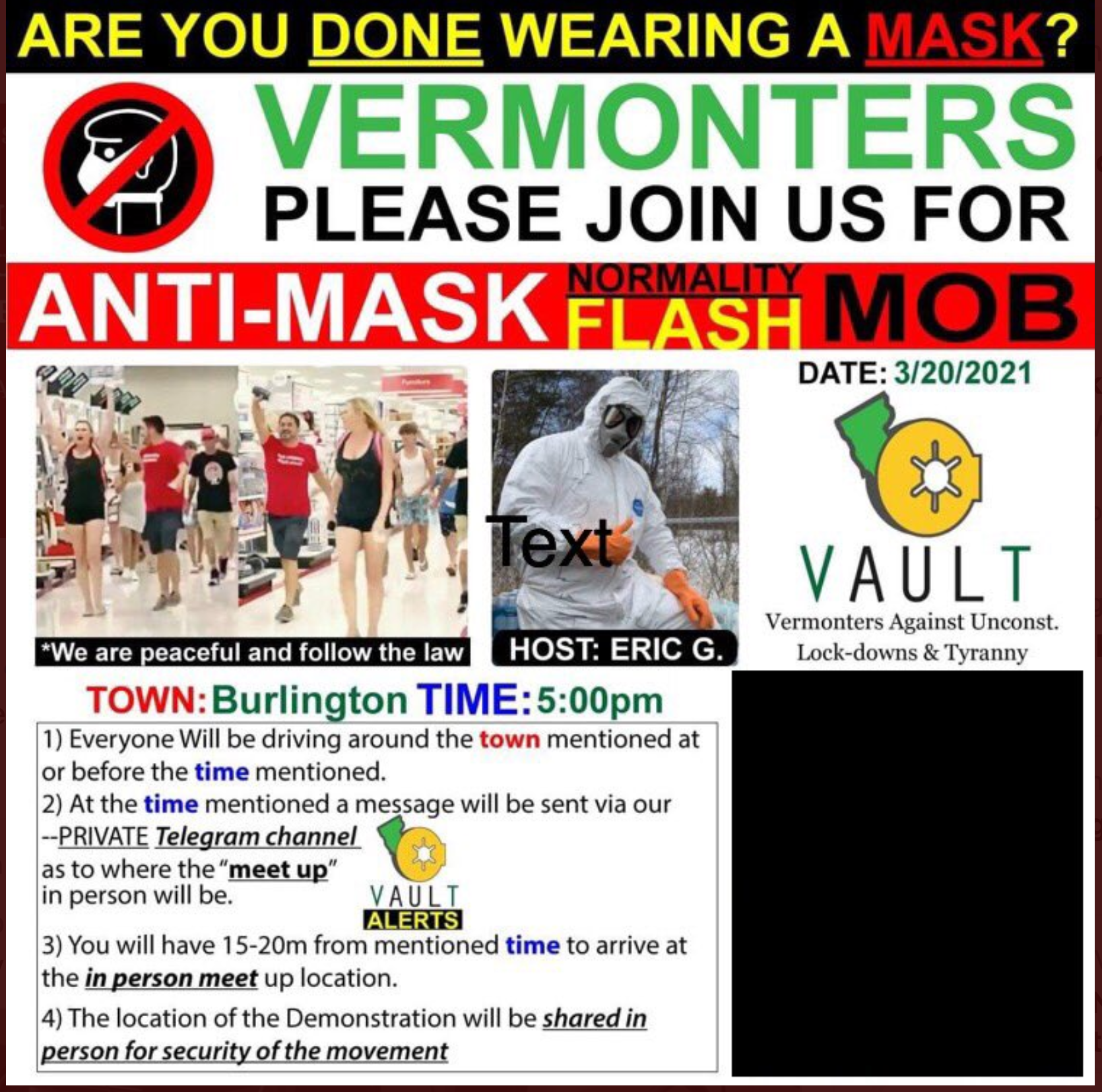 The Burlington “flash mob” event follows a rally at the Statehouse this past Saturday which, by my count, attracted maybe 30 people. I wasn’t there, but a participant uploaded a nine-minute video of the rally on BitChute, a “free speech” alternative to YouTube that’s welcomed many who’ve been banned by mainstream social media sites, including shouty conspiratorialist Alex Jones. The video plays under the headline, “Covid is a Fraud and We Know It.”
