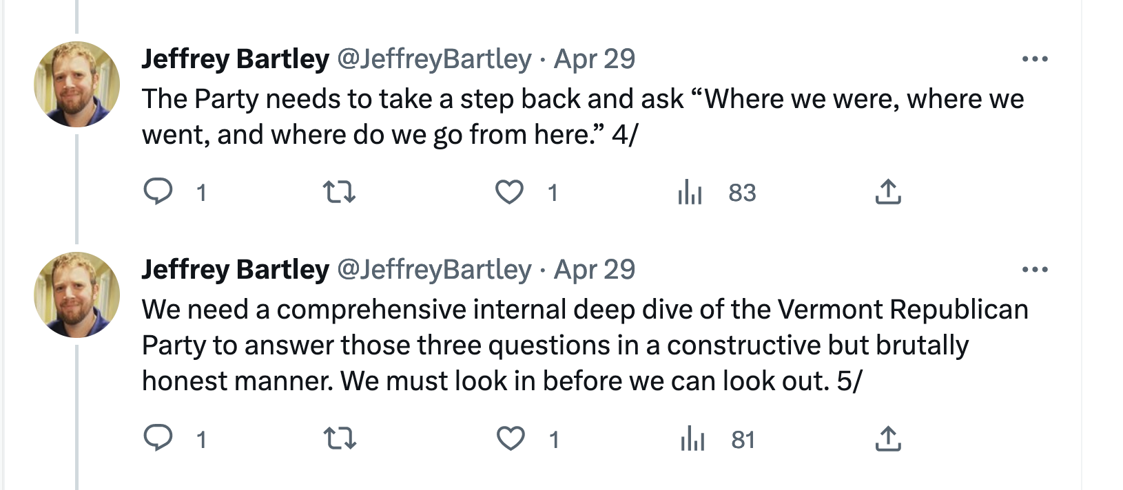 This past weekend, former Vermont Republican Party Executive Director and Ashley’s husband Jeff Bartley posted a lengthy thread on Twitter about what’s wrong with the party and how to try to fix it. The thread was thoughtful and substantive. And there’s not a chance in hell that the VTGOP will pay him any heed. Instead, the party is doubling down on the strategery that landed it in the political wilderness.