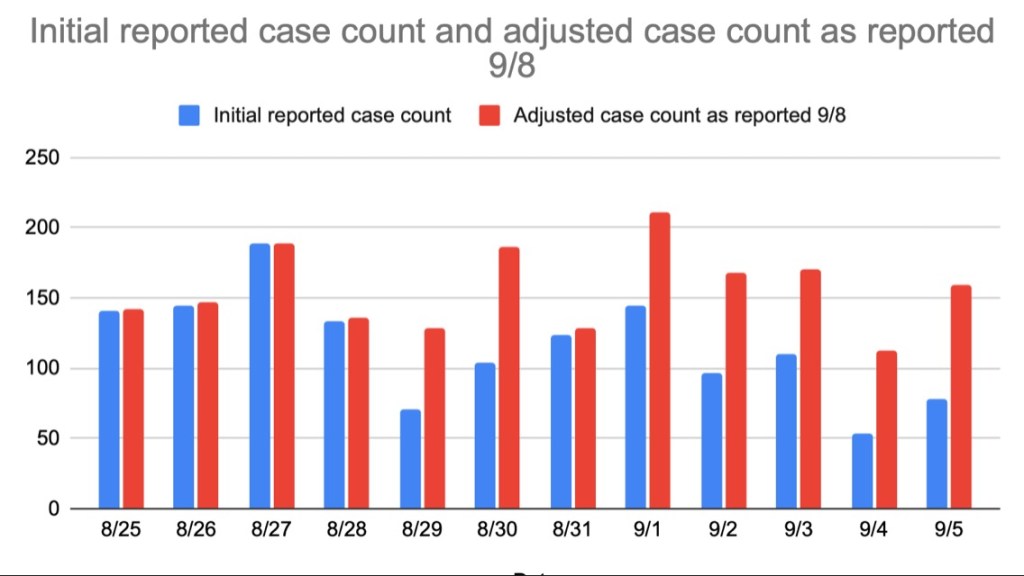 This here chart illustrates a troubling development in the last week-plus: Vermont’s initial daily Covid count has been consistently revised upward a day later. Some of the revisions are dramatic. And, as VTDigger reported, the trend continued big-time over the Labor Day weekend. The original case counts for Saturday, Sunday and Monday totaled 242 cases. The one-day-later revised counts totaled 438. Yep, they almost doubled from original report to later revision.