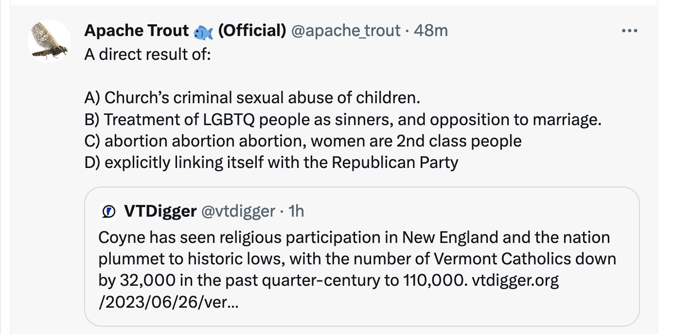 Well, thanks to Matano, the views of Vermont Catholics are shut out of the process.